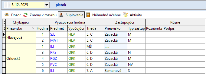 Ružbacká A. 1. - 5. hodinu zastupuje P. Zavacká