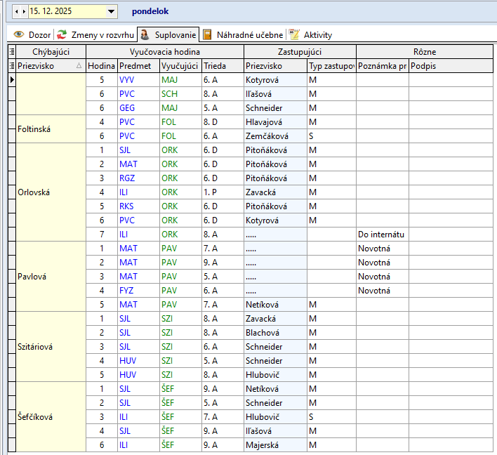 Ružbacká A. 1. - 5. hodinu zastupuje P. Zavacká