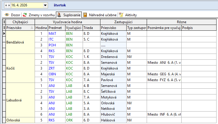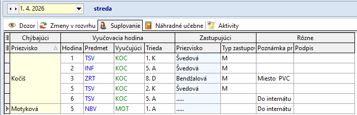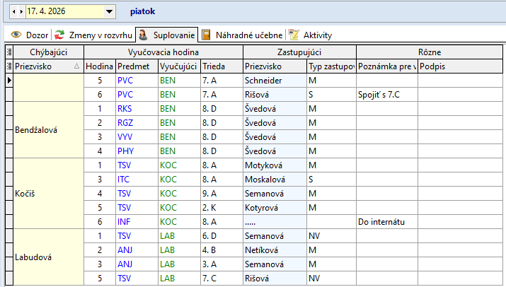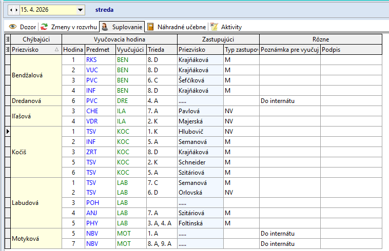 Žiaci, ktorí sa nezúčastnia korčuľovania: Bendík (2.A), Tulej (4.A), Kováčová (9.A), Bilá (8.A) sa zhromaždia v 2.A. Dozor v 2.A má počas 4. hodiny – Džubáková, počas 5. hodiny - Krajňáková