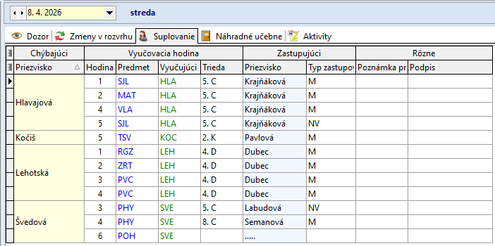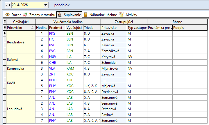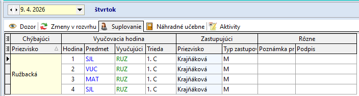 Ružbacká A. 1. - 5. hodinu zastupuje P. Zavacká