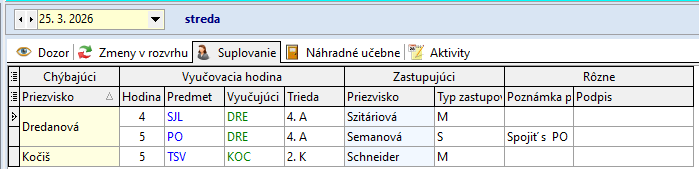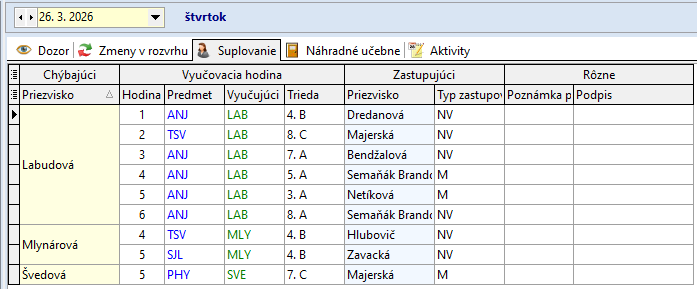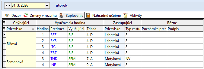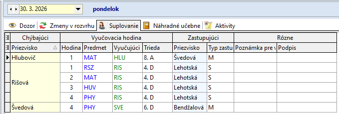 Ružbacká A. 1. - 5. hodinu zastupuje P. Zavacká